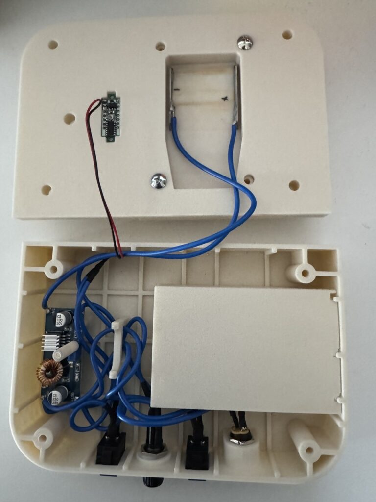 これで完成です。18V→12Vになっています。(使用予定の機器が12Vのため)ちなみに、3Vまで降圧することが出来て、電圧表示計の下の凸棒から調整できます。電流は3A以下を想定してヒューズを取り付けており、カバーを開けずに外から交換できるように設計されています。