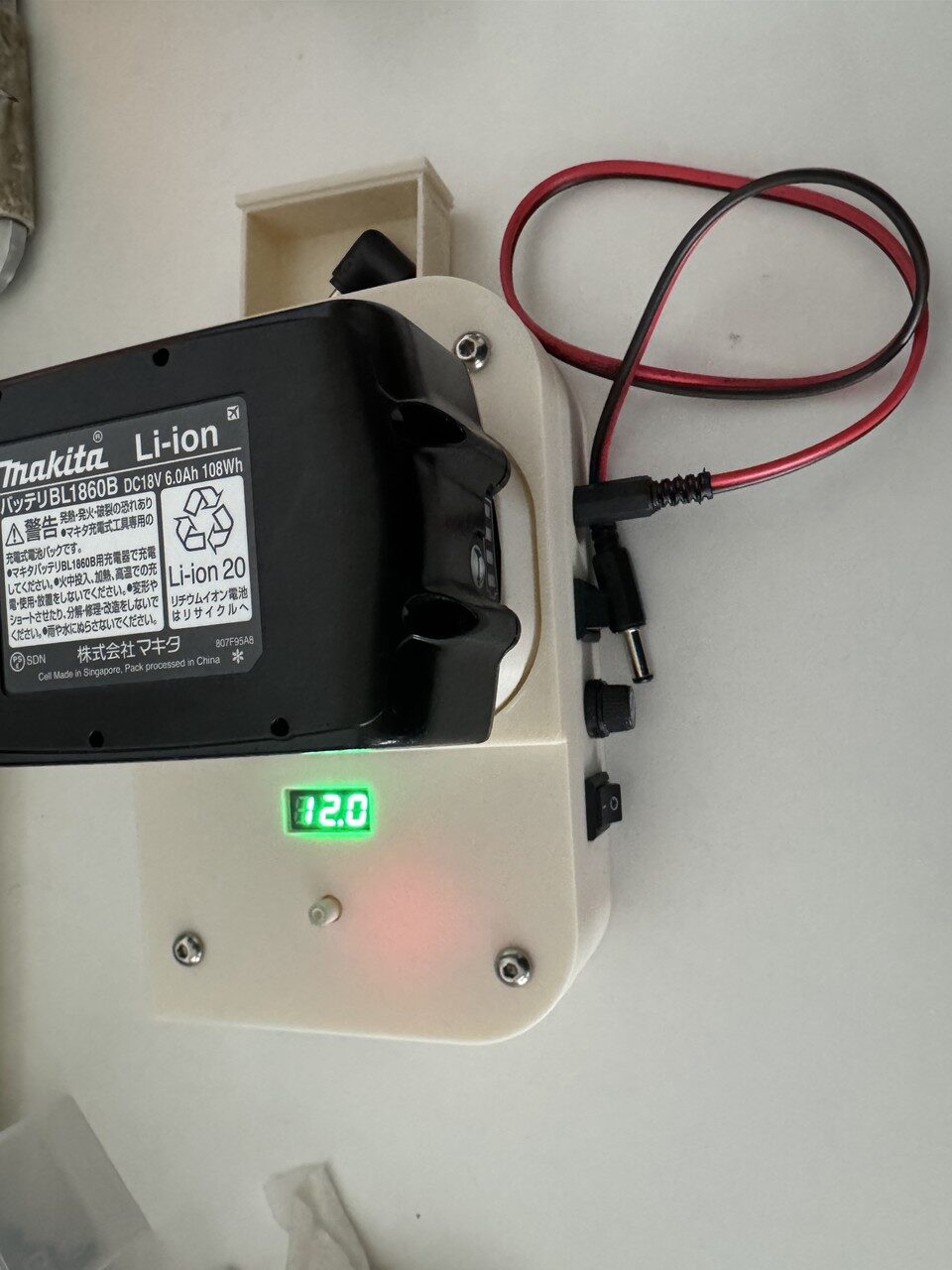 表題通りです。マキタ純正バッテリー(18V)を使用して、コンセントなしで電子機器を動かせたらいいなと思ったのがきっかけです。